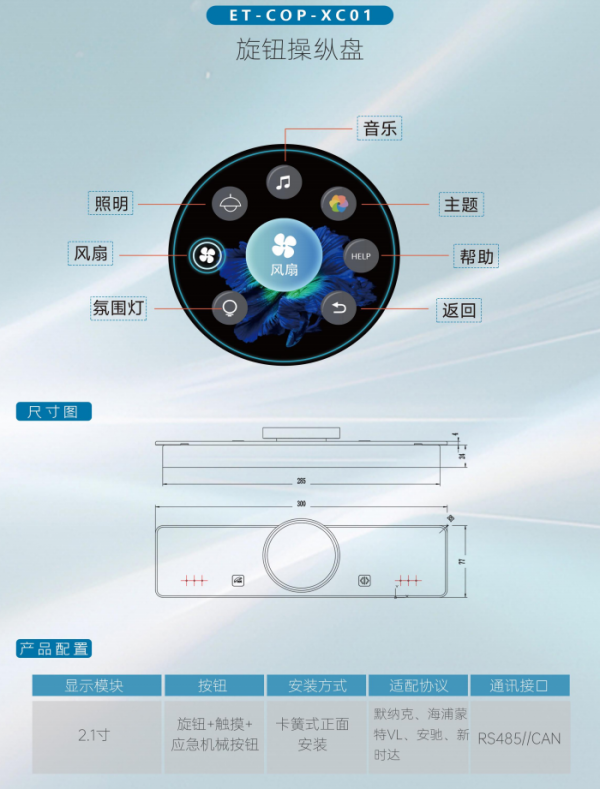 - 革邦自主研发推出的别墅电梯专用旋钮操纵盘,主要适配平台梯、观光梯等梯型,是集楼层选层、楼层显示、灯光控制,应急通话等多功能为一体的高清旋钮触控屏。